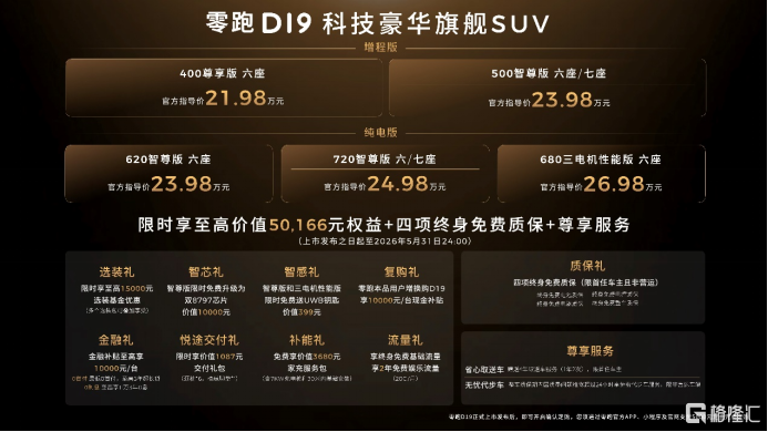 2026年4月16日,零跑旗舰D平台首款车型——零跑D19正式上市,售价21.98-26.98万元。新车定位"科技豪华旗舰SUV",以旗舰级的美学、舒适、续航、智能、驾控、安全六大全维体验,彻底打破"旗舰即高价"的行业陈规,旨在重塑30万内全尺寸SUV的价值标杆,让真正的旗舰体验成为更多家庭的幸福之选。发布会现场,零跑D系列代言人费翔先生亲临助阵,零跑科技创始人、董事长、CEO朱江明先生为费翔交付首台零跑D19,双方共同见证这款旗舰车型正式上市,标志着零跑品牌向上与科技普惠迈入全新阶段。